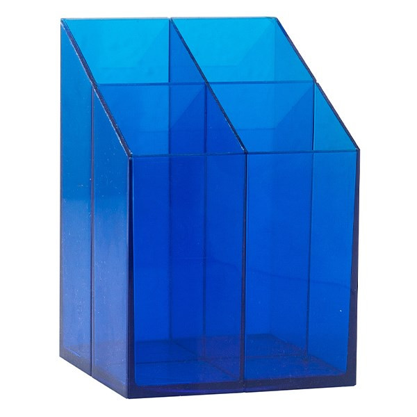 Asztali írószertartó szögletes kivitelben, 4 tárolórekesszel. Választható színek: transzparens kék, transzparens fekete. Feltöltés nélkül!