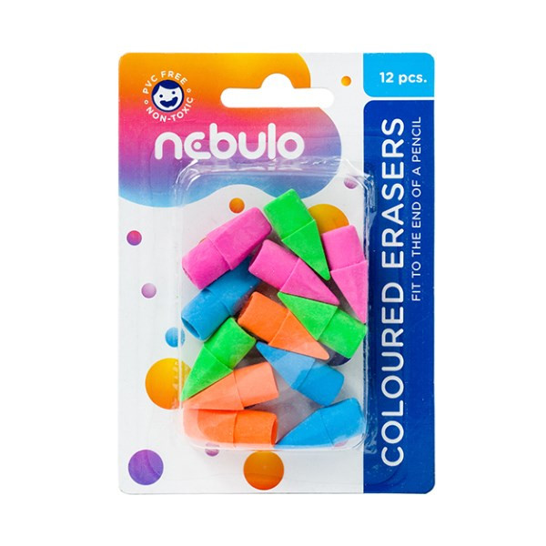 A ceruza végére húzható színes radírok. 12 db/bliszter. PVC mentes, egészségre káros anyagot nem tartalmaz.