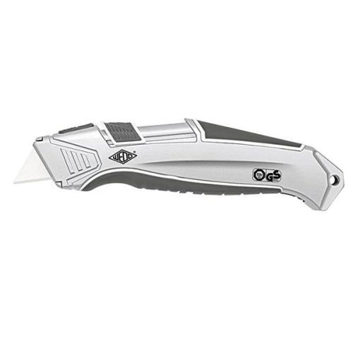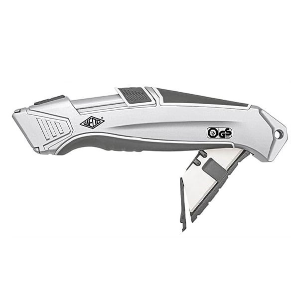 Biztonsági vágókés fém testtel, gumi fogórésszel, kerámia pengével + 3 pót pengével. A penge a vágás után azonnal visszahúzódik, akkor is ha a csúszka előre van tolva. Jobb- és balkezesek számára is alkalmas. A masszív alumínium burkolat gumi fogórészekkel kényelmesen és biztonságosan fekszik a kézben. Méretei: 16,5x2x4 cm Csere penge az alábbi cikkszámon érhető el: 06.00860, 06.00859